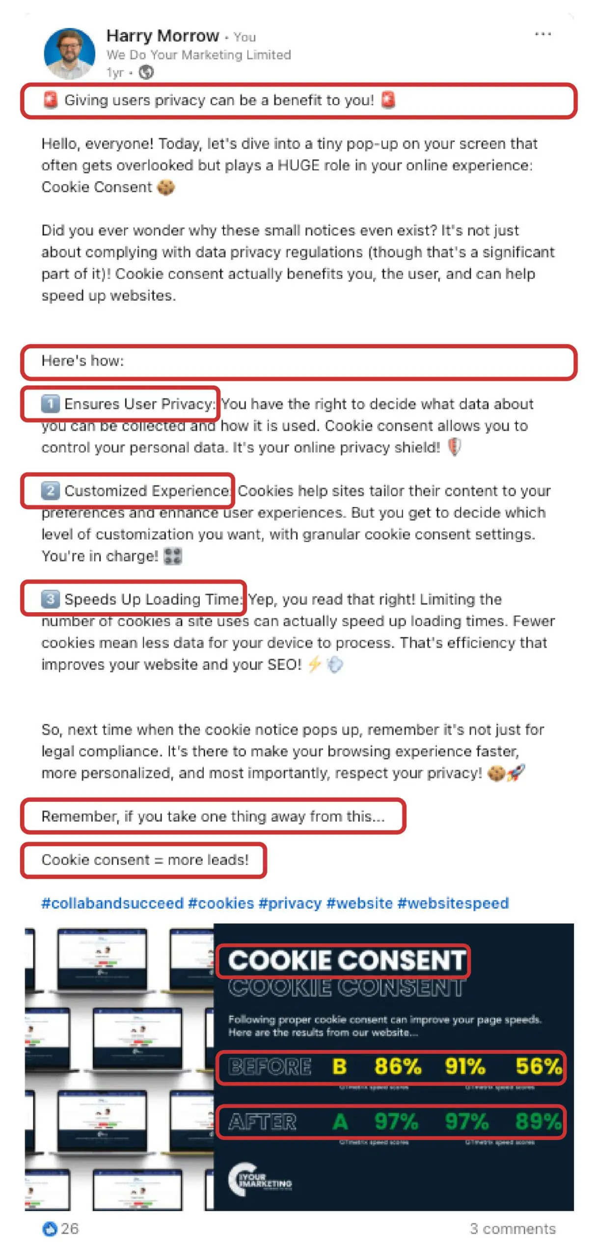 Here is how a ‘D’ sees a short-form social media post and the elements they will care about. We have highlighted these inside clear boxes to help you understand what kinds of things they will care about.
